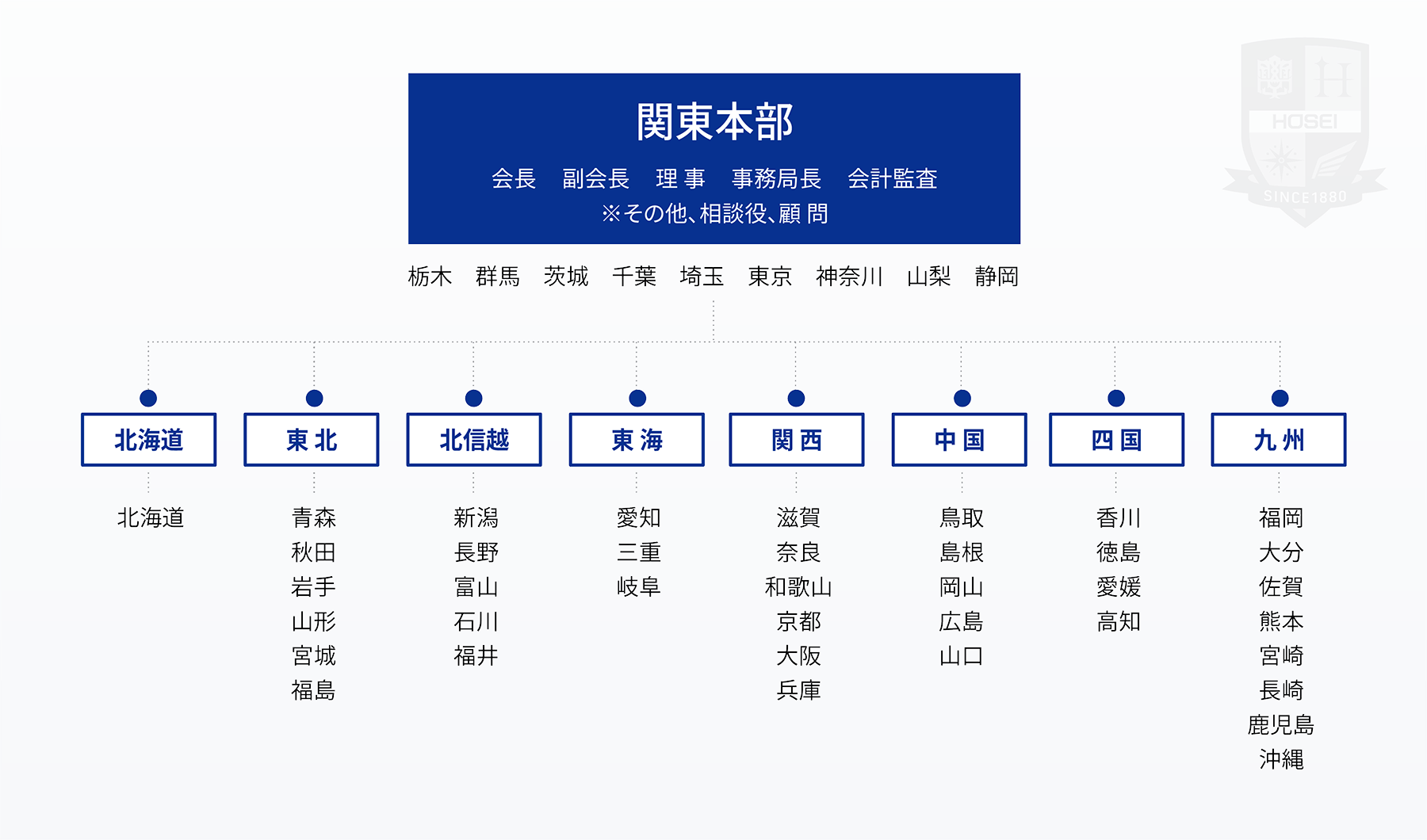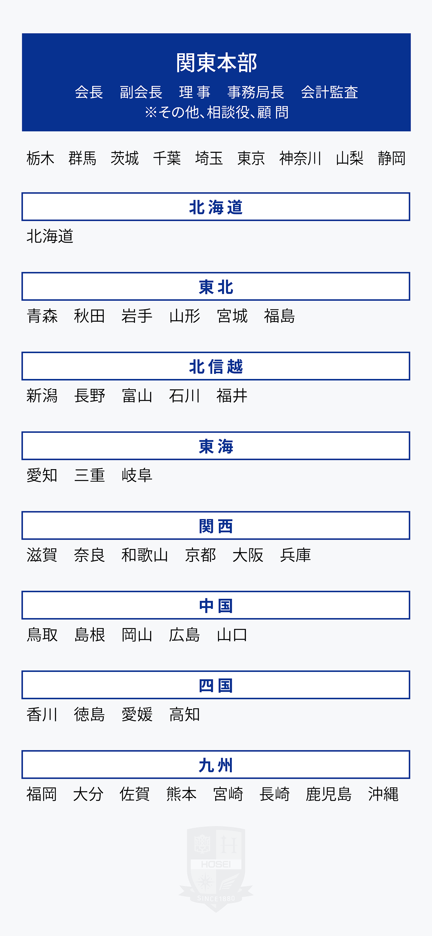 | 支部長 | 北海道/高岡茂夫(S47) 東北/山崎正之(S59) 北信越/清水文雄(S50) 東海/横井隆幸(H1) 関西/田中徹也(H6) 中国/原田朋隆(H11) 四国/三谷勝水(S49) 九州/徳永利美(S53) |
